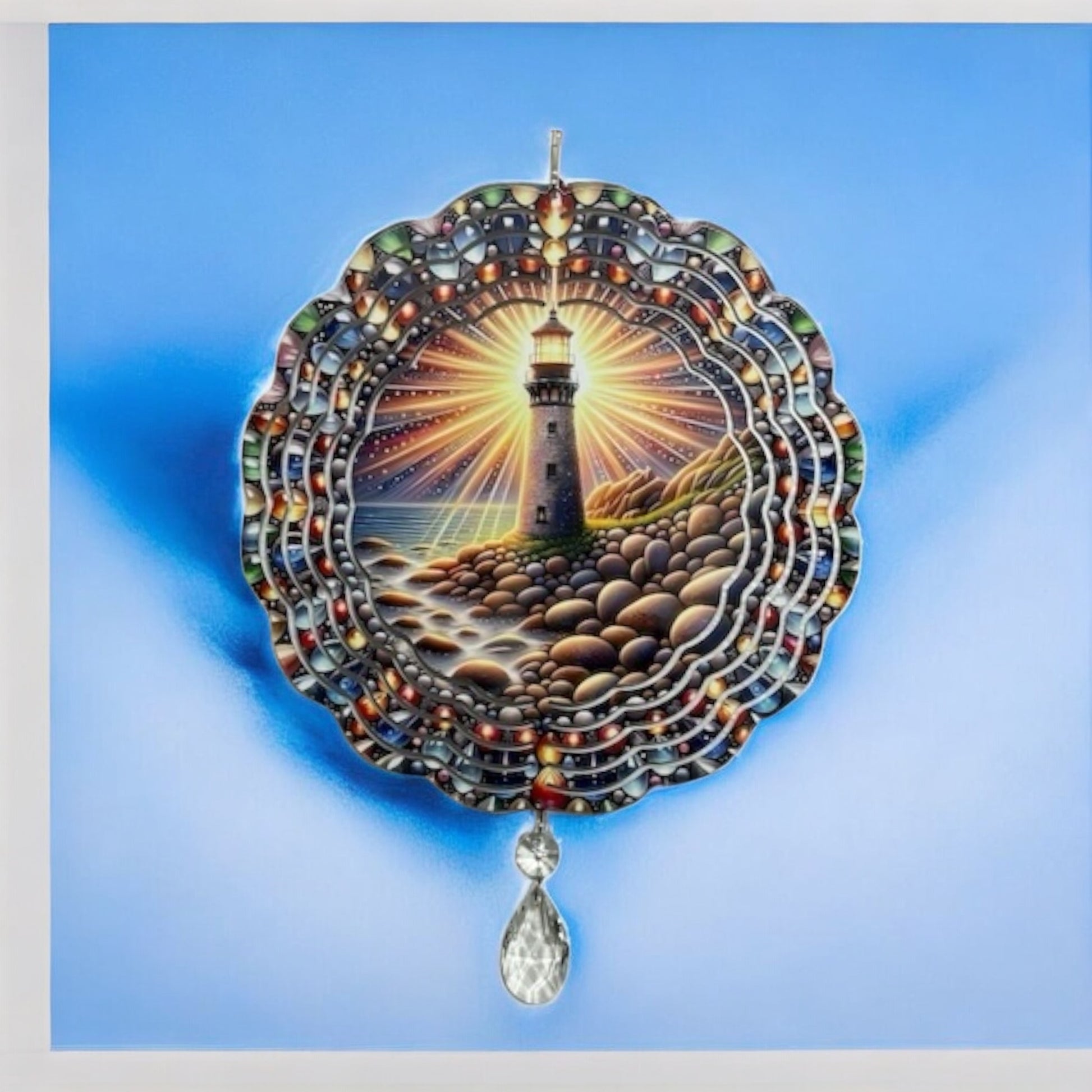 The Lighthouse Wind Spinner artfully combines maritime charm with kinetic elegance. Featuring a detailed lighthouse design perched on textured rocks, accented by jewel-like highlights, this spinner catches the breeze to create captivating movement. Crafted for durability and visual appeal, it enhances outdoor spaces with both a coastal aesthetic and dynamic motion. Perfect for garden decoration or patio ambiance, it brings a touch of expert craftsmanship to any setting.